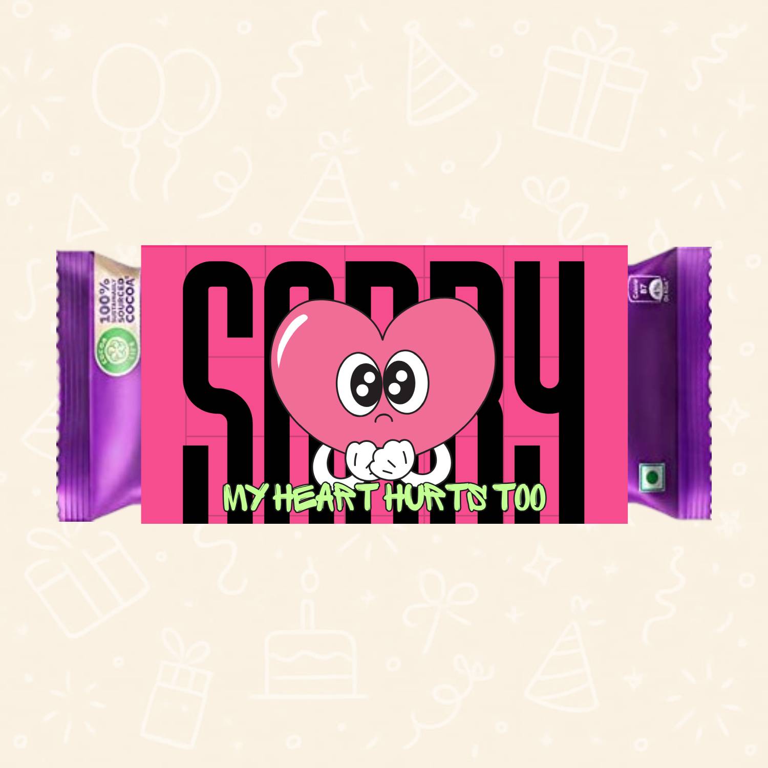 This printable chocolate bar wrapper features a tender message: “Sorry – My Heart Hurts Too”, paired with a simple sad heart illustration. It’s the perfect way to express regret, love, and the desire to make amends — all in one thoughtful, tangible gesture.